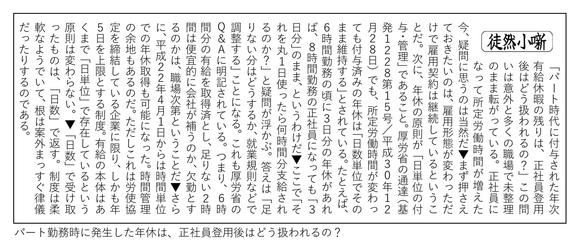 【徒然小噺】パート勤務時に発生した年休は、正社員登用後はどう扱われるの?(2025.7.17)