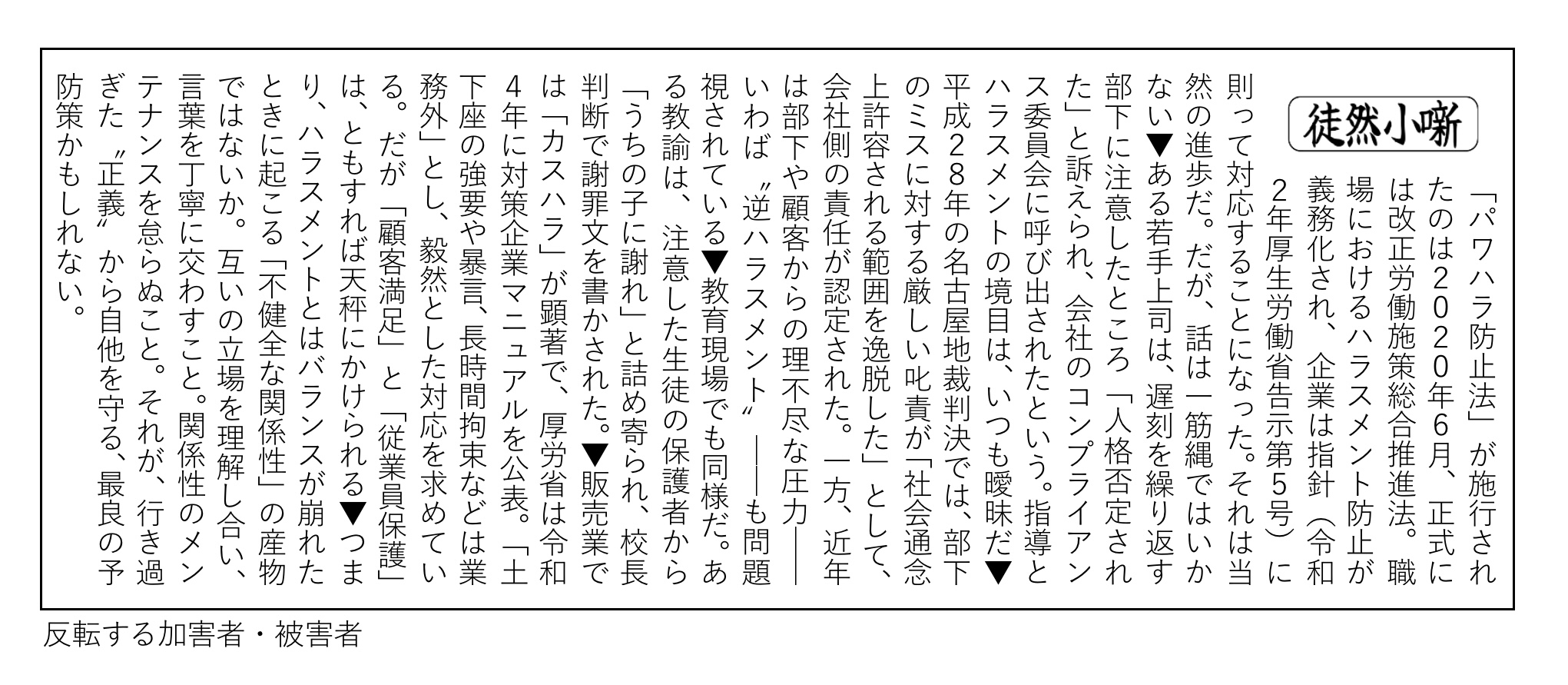 「パワハラ防止法」が施行されたのは2020年6月、正式には改正労働施策総合推進法。職場におけるハラスメント防止が義務化され、企業は指針(令和2年厚生労働省告示第5号)に則って対応することになった。それは当然の進歩だ。だが、話は一筋縄ではいかない▼ある若手上司は、遅刻を繰り返す部下に注意したところ「人格否定された」と訴えられ、会社のコンプライアンス委員会に呼び出されたという。指導とハラスメントの境目は、いつも曖昧だ▼平成28年の名古屋地裁判決では、部下のミスに対する厳しい叱責が「社会通念上許容される範囲を逸脱した」として、会社側の責任が認定された。一方、近年は部下や顧客からの理不尽な圧力——いわば〝逆ハラスメント〟——も問題視されている▼教育現場でも同様だ。ある教諭は、注意した生徒の保護者から「うちの子に謝れ」と詰め寄られ、校長判断で謝罪文を書かされた。▼販売業では「カスハラ」が顕著で、厚労省は令和4年に対策企業マニュアルを公表。「土下座の強要や暴言、長時間拘束などは業務外」とし、毅然とした対応を求めている。だが「顧客満足」と「従業員保護」は、ともすれば天秤にかけられる▼つまり、ハラスメントとはバランスが崩れたときに起こる「不健全な関係性」の産物ではないか。互いの立場を理解し合い、言葉を丁寧に交わすこと。関係性のメンテナンスを怠らぬこと。それが、行き過ぎた〝正義〟から自他を守る、最良の予防策かもしれない。