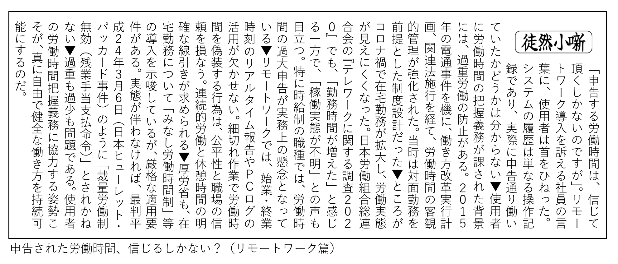 「申告する労働時間は、信じて頂くしかないのですが」。リモートワーク導入を訴える社員の言葉に、使用者は首をひねった。システムの履歴は単なる操作記録であり、実際に申告通り働いていたかどうかは分からない▼使用者に労働時間の把握義務が課された背景には、過重労働の防止がある。2015年の電通事件を機に、働き方改革実行計画、関連法施行を経て、労働時間の客観的管理が強化された。当時は対面勤務を前提とした制度設計だった▼ところがコロナ禍で在宅勤務が拡大し、労働実態が見えにくくなった。日本労働組合総連合会の『テレワークに関する調査2020』でも、「勤務時間が増えた」と感じる一方で、「稼働実態が不明」との声も目立つ。特に時給制の職種では、労働時間の過大申告が実務上の懸念となっている▼リモートワークでは、始業・終業時刻のリアルタイム報告やPCログの活用が欠かせない。細切れ作業で労働時間を偽装する行為は、公平性と職場の信頼を損なう。連続的労働と休憩時間の明確な線引きが求められる▼厚労省も、在宅勤務について「みなし労働時間制」等の導入を示唆しているが、厳格な適用要件がある。実態が伴わなければ、最判平成24年3月6日(日本ヒューレット・パッカード事件)のように「裁量労働制無効(残業手当支払命令)」とされかねない▼過重も過少も問題である。使用者の労働時間把握義務に協力する姿勢こそが、真に自由で健全な働き方を持続可能にするのだ。