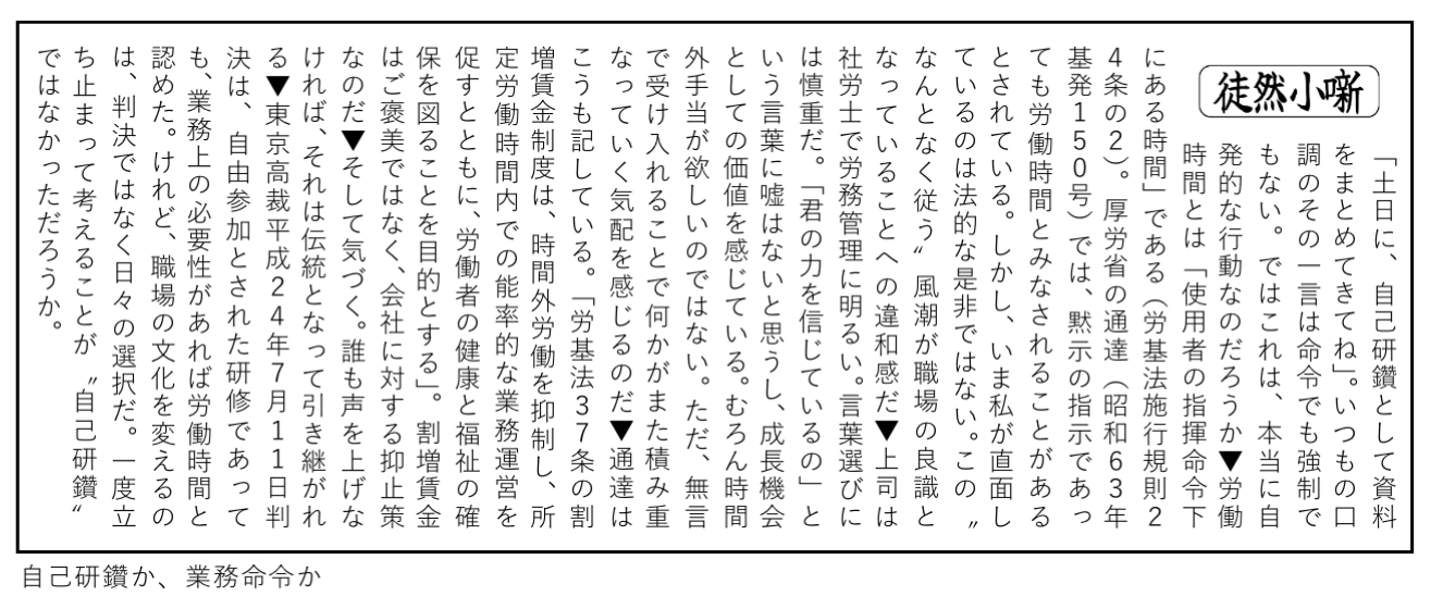 「土日に、自己研鑽として資料をまとめてきてね」。いつもの口調のその一言は命令でも強制でもない。ではこれは、本当に自発的な行動なのだろうか▼労働時間とは「使用者の指揮命令下にある時間」である(労基法施行規則24条の2)。厚労省の通達(昭和63年基発150号)では、黙示の指示であっても労働時間とみなされることがあるとされている。しかし、いま私が直面しているのは法的な是非ではない。この〝なんとなく従う〟風潮が職場の良識となっていることへの違和感だ▼上司は社労士で労務管理に明るい。言葉選びには慎重だ。「君の力を信じているの」という言葉に嘘はないと思うし、成長機会としての価値を感じている。むろん時間外手当が欲しいのではない。ただ、無言で受け入れることで何かがまた積み重なっていく気配を感じるのだ▼通達はこうも記している。「労基法37条の割増賃金制度は、時間外労働を抑制し、所定労働時間内での能率的な業務運営を促すとともに、労働者の健康と福祉の確保を図ることを目的とする」。割増賃金はご褒美ではなく、会社に対する抑止策なのだ▼そして気づく。誰も声を上げなければ、それは伝統となって引き継がれる▼東京高裁平成24年7月11日判決は、自由参加とされた研修であっても、業務上の必要性があれば労働時間と認めた。けれど、職場の文化を変えるのは、判決ではなく日々の選択だ。一度立ち止まって考えることが〝自己研鑽〟ではなかっただろうか。
