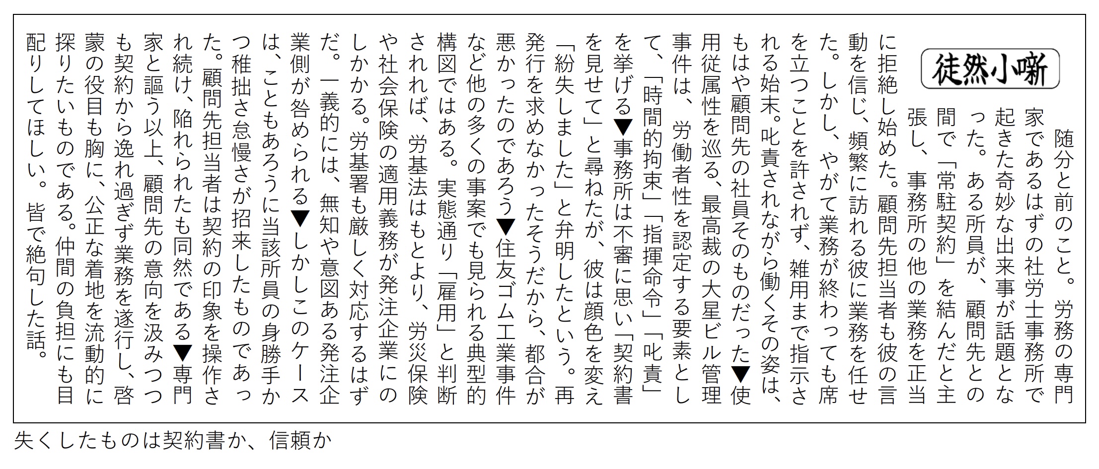 随分と前のこと。労務の専門家であるはずの社労士事務所で起きた奇妙な出来事が話題となった。ある所員が、顧問先との間で「常駐契約」を結んだと主張し、事務所の他の業務を正当に拒絶し始めた。顧問先担当者も彼の言動を信じ、頻繁に訪れる彼に業務を任せた。しかし、やがて業務が終わっても席を立つことを許されず、雑用まで指示される始末。叱責されながら働くその姿は、もはや顧問先の社員そのものだった▼使用従属性を巡る、最高裁の大星ビル管理事件は、労働者性を認定する要素として、「時間的拘束」「指揮命令」「叱責」を挙げる▼事務所は不審に思い「契約書を見せて」と尋ねたが、彼は顔色を変え「紛失しました」と弁明したという。再発行を求めなかったそうだから、都合が悪かったのであろう▼住友ゴム工業事件など他の多くの事案でも見られる典型的構図ではある。実態通り「雇用」と判断されれば、労基法はもとより、労災保険や社会保険の適用義務が発注企業にのしかかる。労基署も厳しく対応するはずだ。一義的には、無知や意図ある発注企業側が咎められる▼しかしこのケースは、こともあろうに当該所員の身勝手かつ稚拙さ怠慢さが招来したものであった。顧問先担当者は契約の印象を操作され続け、陥れられたも同然である▼専門家と謳う以上、顧問先の意向を汲みつつも契約から逸れ過ぎず業務を遂行し、啓蒙の役目も胸に、公正な着地を流動的に探りたいものである。仲間の負担にも目配りしてほしい。皆で絶句した話。