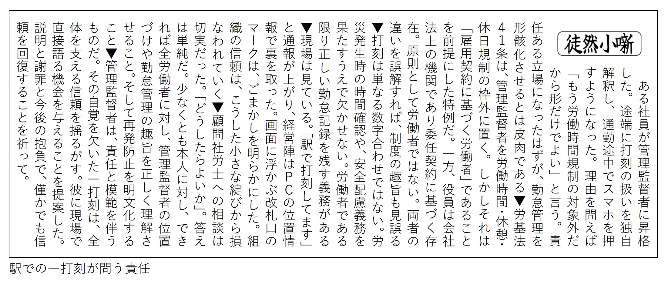 ある社員が管理監督者に昇格した。途端に打刻の扱いを独自解釈し、通勤途中でスマホを押すようになった。理由を問えば「もう労働時間規制の対象外だから形だけでよい」と言う。責任ある立場になったはずが、勤怠管理を形骸化させるとは皮肉である▼労基法41条は、管理監督者を労働時間・休憩・休日規制の枠外に置く。しかしそれは「雇用契約に基づく労働者」であることを前提にした特例だ。一方、役員は会社法上の機関であり委任契約に基づく存在。原則として労働者ではない。両者の違いを誤解すれば、制度の趣旨も見誤る▼打刻は単なる数字合わせではない。労災発生時の時間確認や、安全配慮義務を果たすうえで欠かせない。労働者である限り正しい勤怠記録を残す義務がある▼現場は見ている。「駅で打刻してます」と通報が上がり、経営陣はPCの位置情報で裏を取った。画面に浮かぶ改札口のマークは、ごまかしを明らかにした。組織の信頼は、こうした小さな綻びから損なわれていく▼顧問社労士への相談は切実だった。「どうしたらよいか」。答えは単純だ。少なくとも本人に対し、できれば全労働者に対し、管理監督者の位置づけや勤怠管理の趣旨を正しく理解させること。そして再発防止を明文化すること▼管理監督者は、責任と模範を伴うものだ。その自覚を欠いた一打刻は、全体を支える信頼を揺るがす。彼に現場で直接語る機会を与えることを提案した。説明と謝罪と今後の抱負で、僅かでも信頼を回復することを祈って。