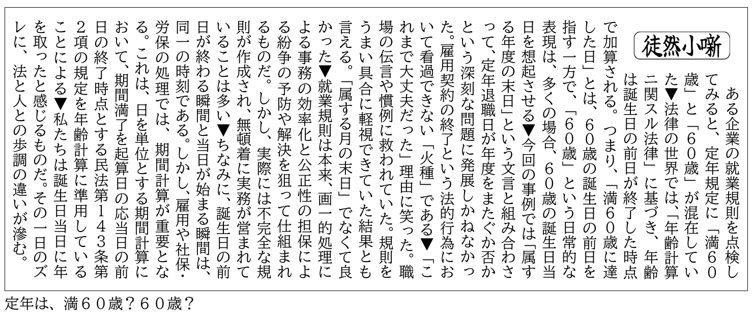 ある企業の就業規則を点検してみると、定年規定に「満60歳」と「60歳」が混在していた▼法律の世界では、「年齢計算ニ関スル法律」に基づき、年齢は誕生日の前日が終了した時点で加算される。つまり、「満60歳に達した日」とは、60歳の誕生日の前日を指す一方で、「60歳」という日常的な表現は、多くの場合、60歳の誕生日当日を想起させる▼今回の事例では「属する年度の末日」という文言と組み合わさって、定年退職日が年度をまたぐか否かという深刻な問題に発展しかねなかった。雇用契約の終了という法的行為において看過できない「火種」である▼「これまで大丈夫だった」理由に笑った。職場の伝言や慣例に救われていた。規則をうまい具合に軽視できていた結果とも言える。「属する月の末日」でなくて良かった▼就業規則は本来、画一的処理による事務の効率化と公正性の担保による紛争の予防や解決を狙って仕組まれるものだ。しかし、実際には不完全な規則が作成され、無頓着に実務が営まれていることは多い▼ちなみに、誕生日の前日が終わる瞬間と当日が始まる瞬間は、同一の時刻である。しかし、雇用や社保・労保の処理では、期間計算が重要となる。これは、日を単位とする期間計算において、期間満了を起算日の応当日の前日の終了時点とする民法第143条第2項の規定を年齢計算に準用していることによる▼私たちは誕生日当日に年を取ったと感じるものだ。その一日のズレに、法と人との歩調の違いが滲む。