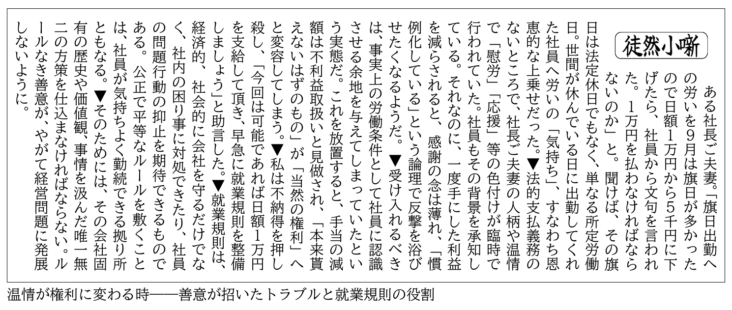 ある社長ご夫妻。「旗日出勤への労いを9月は旗日が多かったので日額1万円から5千円に下げたら、社員から文句を言われた。1万円を払わなければならないのか」と。聞けば、その旗日は法定休日でもなく、単なる所定労働日。世間が休んでいる日に出勤してくれた社員へ労いの「気持ち」、すなわち恩恵的な上乗せだった。▼法的支払義務のないところで、社長ご夫妻の人柄や温情で「慰労」「応援」等の色付けが臨時で行われていた。社員もその背景を承知している。それなのに、一度手にした利益を減らされると、感謝の念は薄れ、「慣例化している」という論理で反撃を浴びせたくなるようだ。▼受け入れるべきは、事実上の労働条件として社員に認識させる余地を与えてしまっていたという実態だ。これを放置すると、手当の減額は不利益取扱いと見做され、「本来貰えないはずのもの」が「当然の権利」へと変容してしまう。▼私は不納得を押し殺し、「今回は可能であれば日額1万円を支給して頂き、早急に就業規則を整備しましょう」と助言した。▼就業規則は、経済的、社会的に会社を守るだけでなく、社内の困り事に対処できたり、社員の問題行動の抑止を期待できるものである。公正で平等なルールを敷くことは、社員が気持ちよく勤続できる拠り所ともなる。▼そのためには、その会社固有の歴史や価値観、事情を汲んだ唯一無二の方策を仕込まなければならない。ルールなき善意が、やがて経営問題に発展しないように。